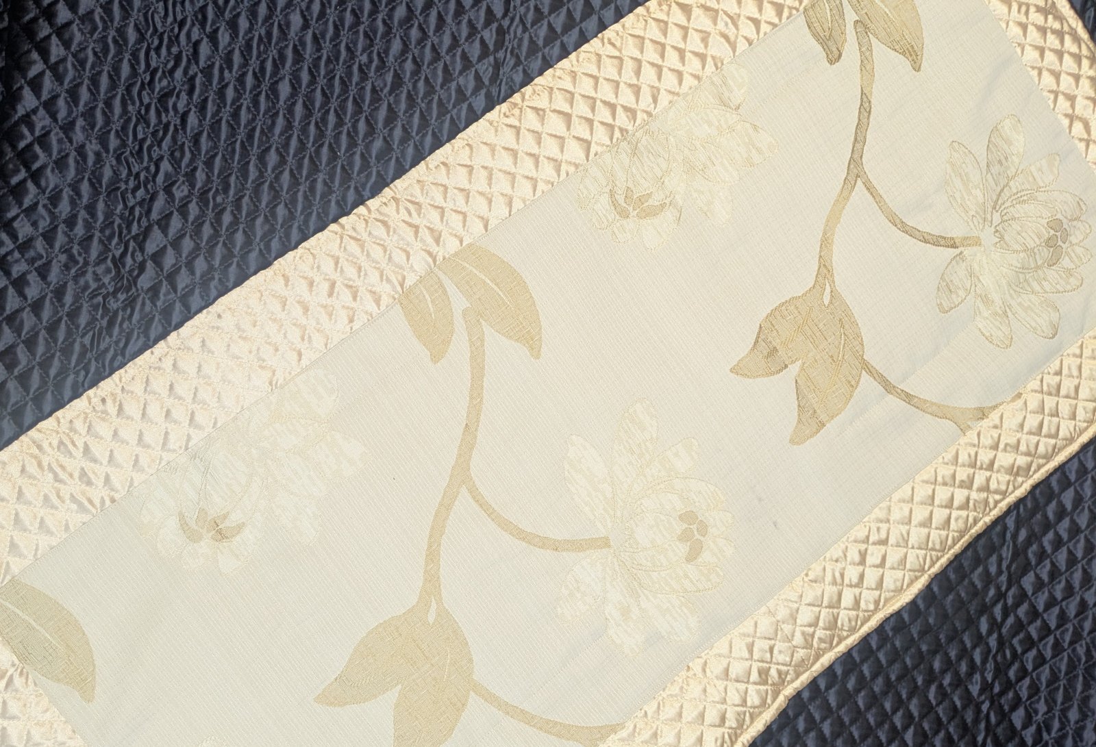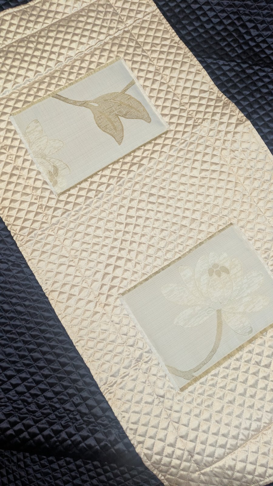 シャンパンゴールドのサテンキルティング地と、金糸で模様を織り込んだちょっと地厚な生地のマリアージュ(*˘︶˘*).。.:*♡